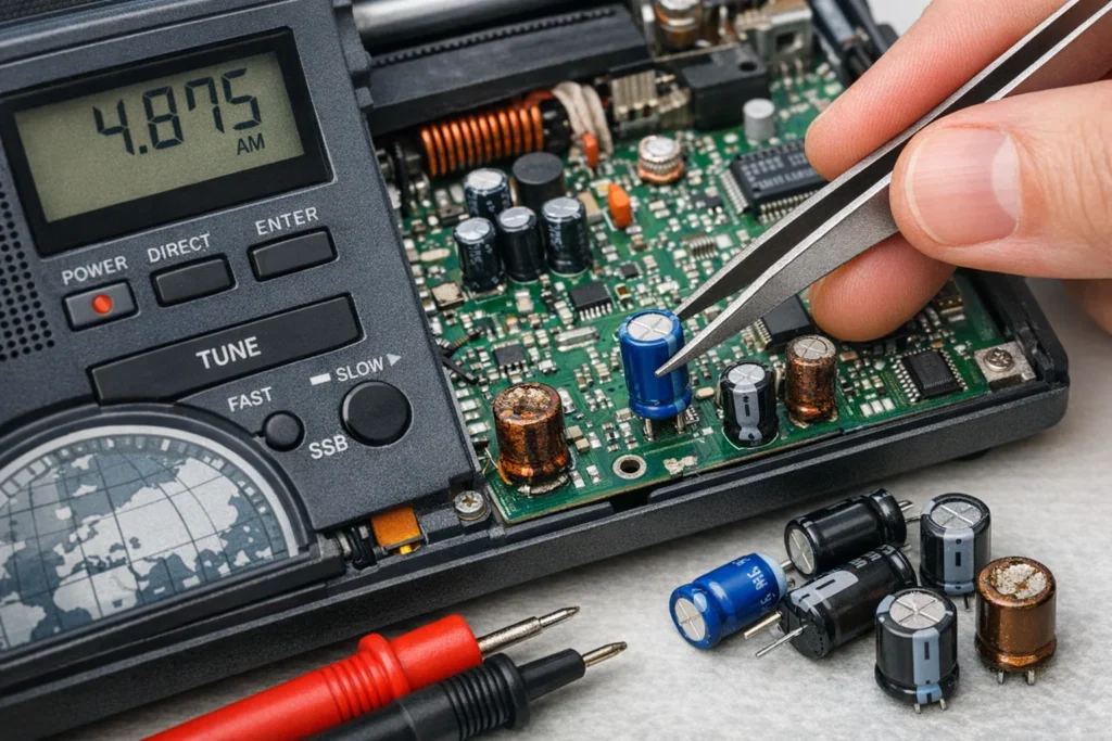 Veel oudere transistor- en wereldontvanger-radio’s hebben elektrolytische condensatoren (elco’s) in hun printplaten. Deze onderdelen zijn cruciaal voor de voeding, ontkoppeling en signaalverwerking in de radio. Na verloop van tijd kan het elektrolyt in deze elco’s lekken, uitdrogen of defect raken, met storingen tot gevolg — zoals ruis, uitval, slechte ontvangst of zelfs complete uitval van de radio.